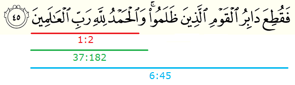 | (1:2) الْحَمْدُ لِلَّهِ رَبِّ الْعَالَمِينَ | 5 | (6:45), (10:10), (37:182), (39:75), (40:65) |