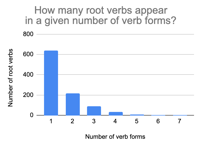 It turns out that it’s not common for root verbs to appear in multiple verb forms, and the higher the number of verb forms, the fewer root verbs fit the pattern. There are only two root verbs that appear across more than five verb forms.
